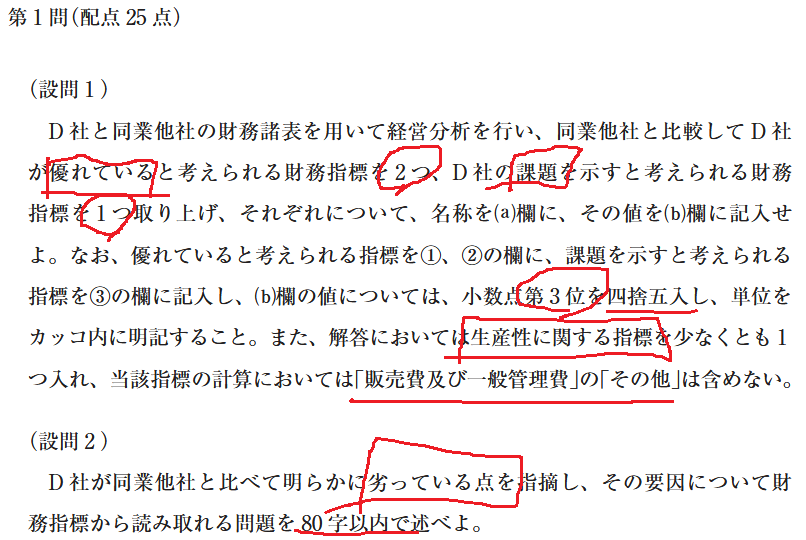 まずは、問題文から確認しましょう。(設問1)ではD社と同業他社の比較で、「優れている」指標を「2つ」、「課題を示す」指標を「1つ」挙げ、さらに「D社」の指標を計算し、「小数点第3位を四捨五入」して答えることが求められています。なお、「生産性に関する指標」を少なくとも1つ挙げることになっています。これは過去の問題には見られなかった視点のため、注意が必要です。また、(設問2)では、「明らかに劣っている点」について「80字」で述べる必要があります。これまでの問題では、「D社全体の状況」をまとめる問題が多かったので、設問要求を間違えないようにしましょう。