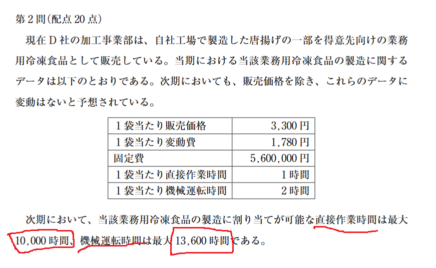 - D社の冷凍唐揚げに関する生産能力には、直接作業時間(最大10,000時間)と機械運転時間(最大13,600時間)の制約がある
