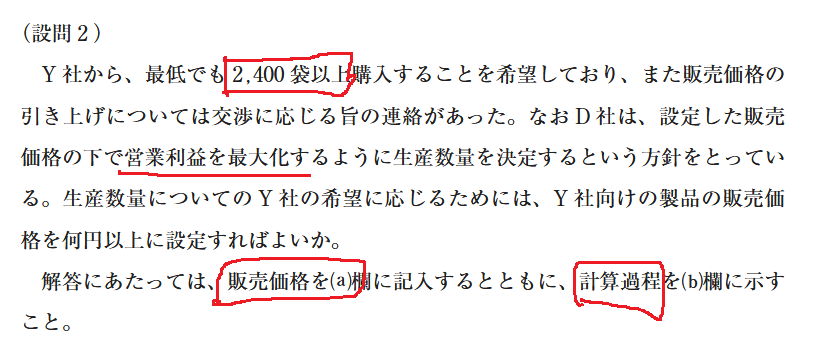 ただ、新しい販売価格は2,400袋を最低限とする条件によって生じた値であり、元の設問1の条件に影響を与えるものではないため、4,895円の方が良いと考えます。