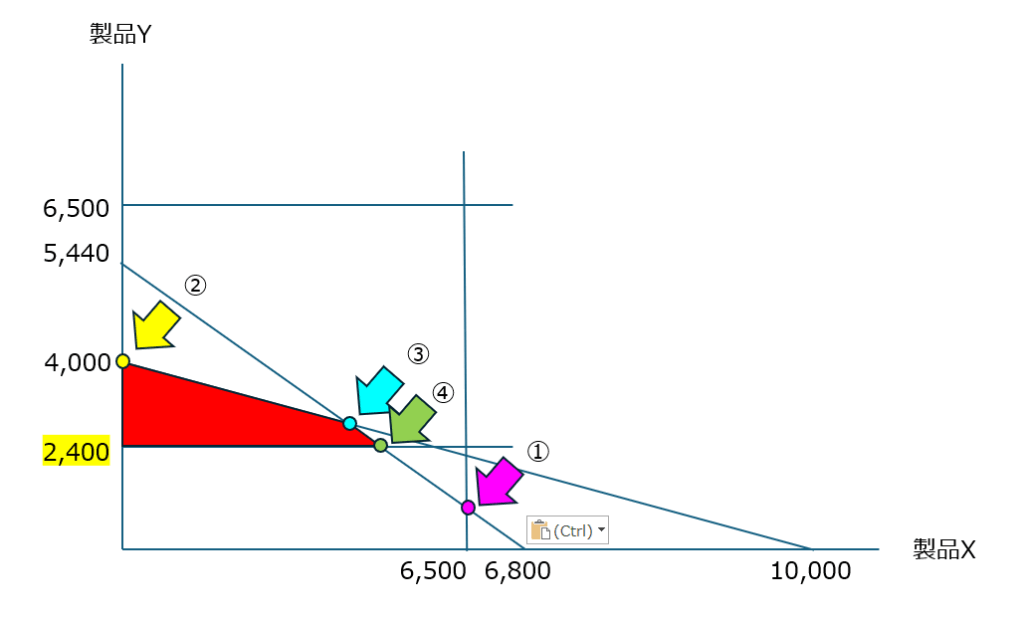 これらをグラフ化すると以下の様になります。赤く色を塗った領域が条件に合致する部分で、利益額が最高になり得るのは、各頂点①②③の部分となります。