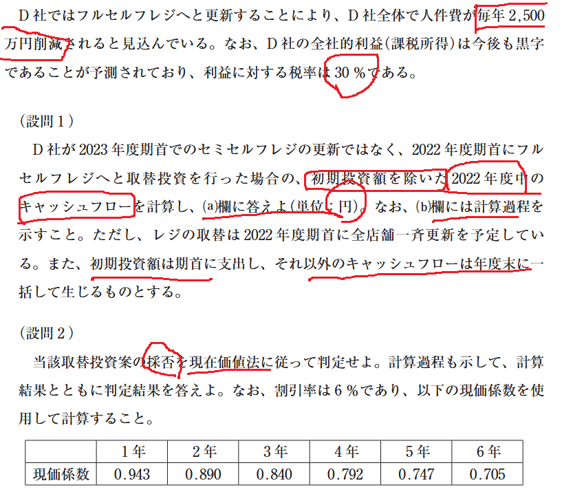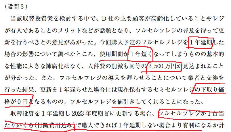 この問題は、既存のセミセルフレジから新たにフルセルフレジに取り換え投資するにあたっての意思決定を問う問題となっています。複雑な条件が長い問題文の中に散在しており、試験で限られた時間の中では非常に解きにくい問題といえますが、練習を重ねることで最低限、設問1,2については完全に解答することが可能になると思われます。