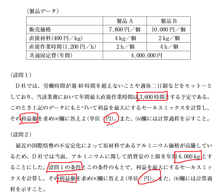 - 製品A:限界利益=単価7,800円-直接材料費400円/kg×4kg-直接作業時間1,200円/h×2h=3,800円/個
