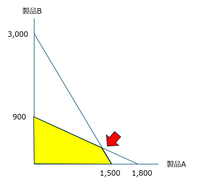 - グラフの切片、つまり製品Aのみ、またはBのみを生産する場合と比較して、交点での利益が最大となるため、ここが最適解(製品Aは1,400個、製品Bは200個)となる